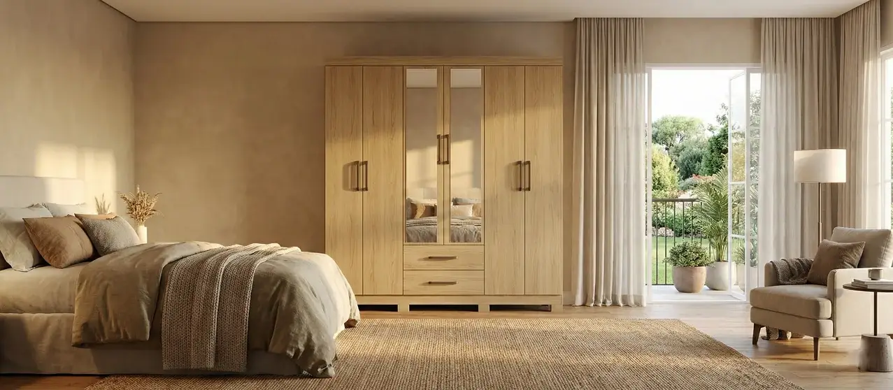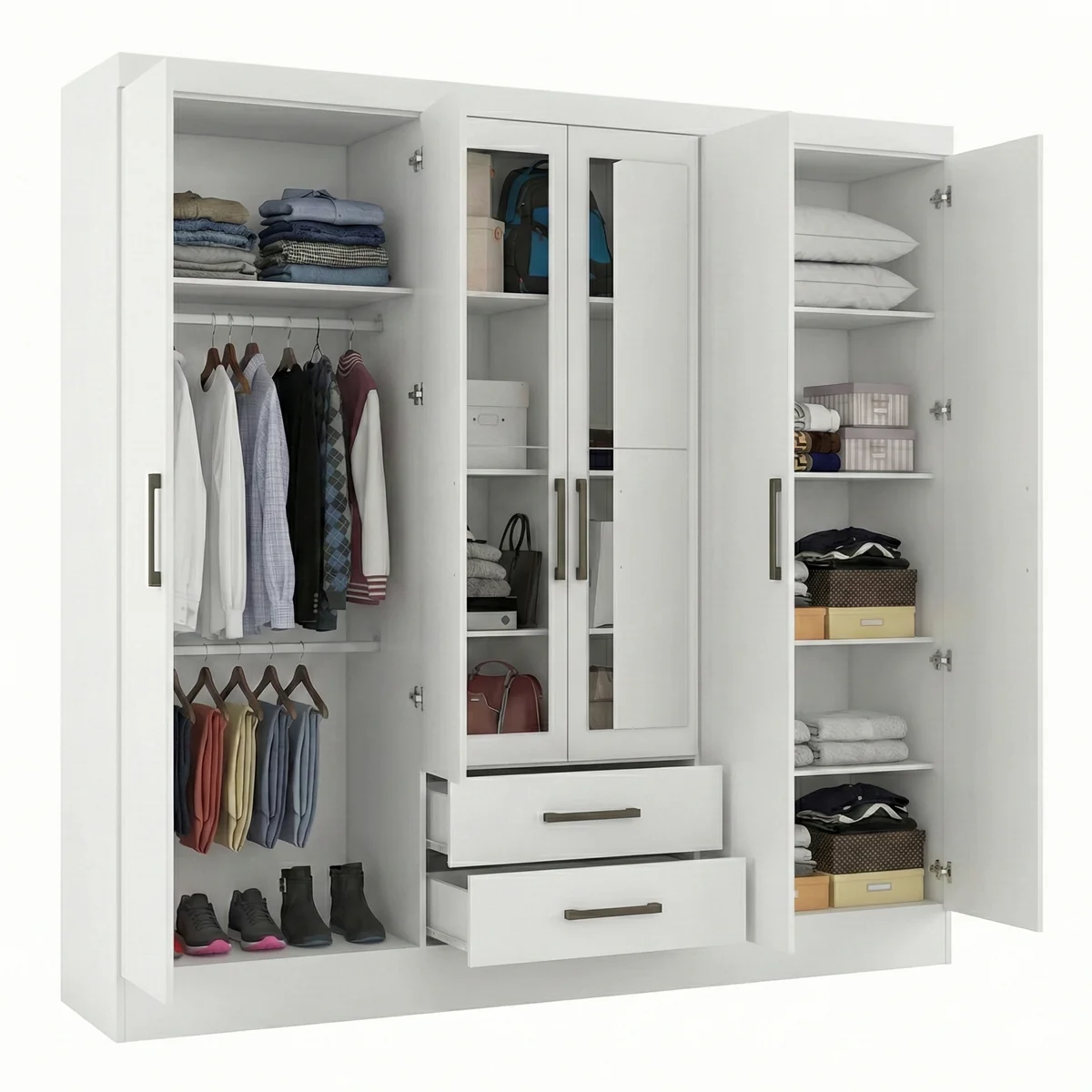 Com 6 portas e dobradiças de pressão, oferece um uso mais prático no dia a dia. Possui ainda 2 gavetas com corrediças metálicas, perfeitas para guardar peças menores, acessórios e itens pessoais com mais organização. O cabideiro ajuda a manter roupas penduradas e bem acomodadas, evitando amassar.